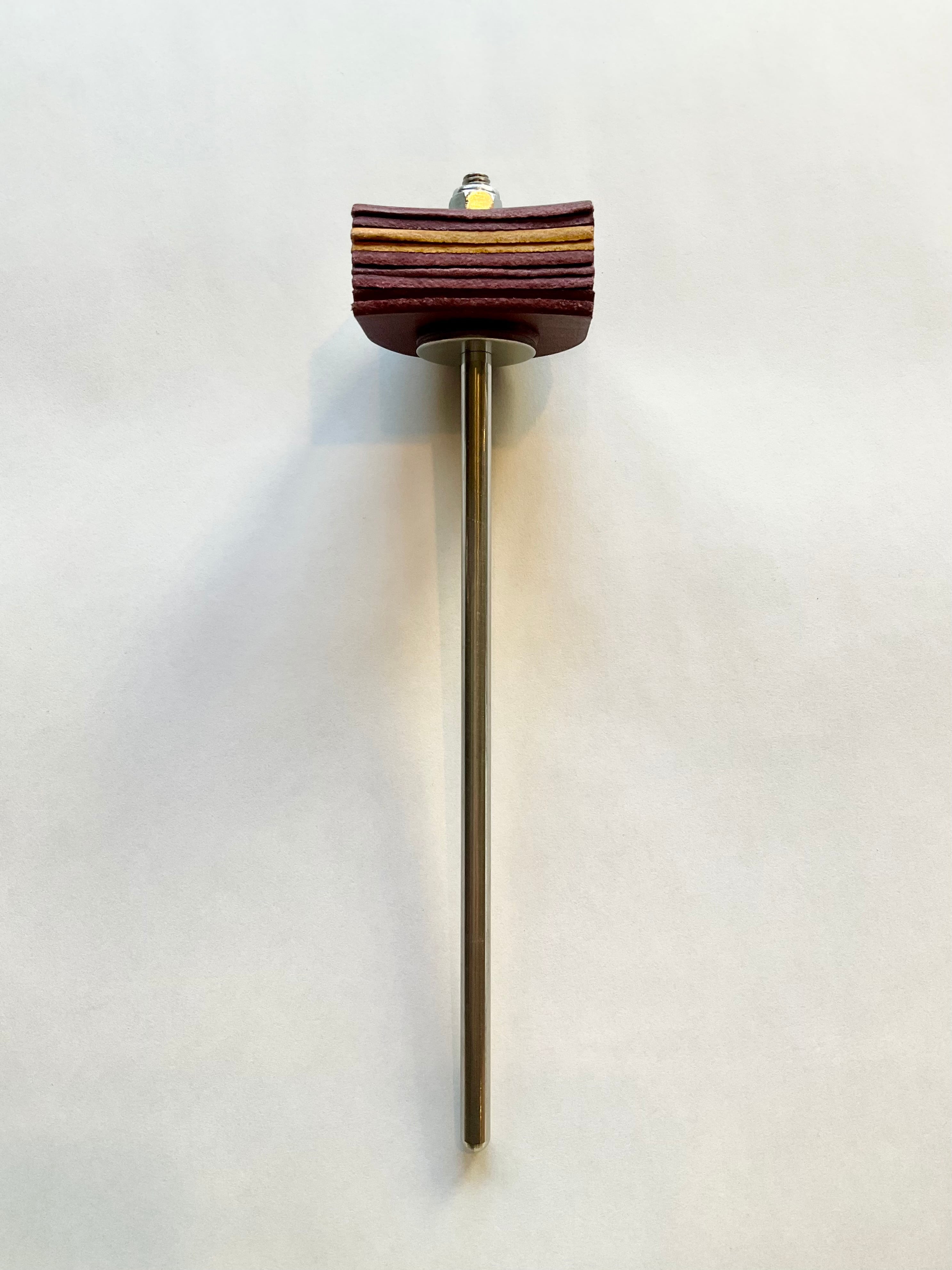 大小異なるレザーを交互に重ねたミルフィーユ状のレザー製のヘッドと、フラットな平面ヘッドを備えた”2WAY”仕様のオリジナルビーターです。